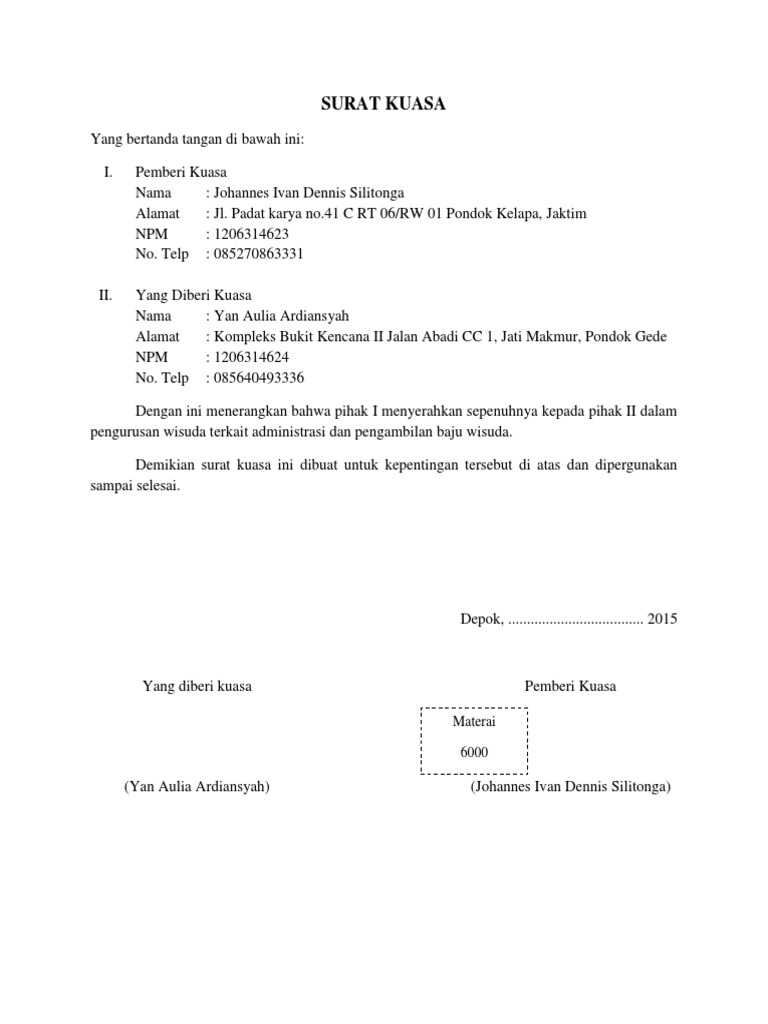 Pada umumnya surat kuasa sering digunakan sebuah hal yang berhubungan dengan pengambilan suatu barang, misalnya pengambilan gaji, uang, dana, bpkb atau yang lainnya. Begini, secara umum surat kuasa adalah sebuah surat yang berisi pernyataan bahwa kita memberikan kuasa atau wewenang kepada seseorang secara resmi untuk menggantikan. Penyimpanan dan pengambilan risalah lelang a. Surat kuasa adalah surat yang dibuat dengan tujuan untuk memberikan wewenang kepada pihak tertentu guna melakukan atau melaksana kan suatu tugas atas nama si pemberi kuasa. Namun dikarenakan sedang berhalangan, maka penggunaan surat kuasa bisa dijadikan solusi, yakni dengan cara memberikan wewenang kepada orang lain untuk mengurus pengambilan anda bisa menggunakan salah satu dari berbagai macam contoh surat kuasa pengambilan ijazah yang tersedia. Namun dengan kebijakan sekolah maka saat ini pengambilan ijazah dapat diwakilkan dengan berbagai syarat. Surat kuasa pengambilan bpkb di bank, bca finance, bri, bni dll. Surat kuasa pengambilan uang pada dasarnya sama dengan jenis surat kuasa lainnya, yaitu dokumen tertulis yang menerangkan pelimpahan kekuasaan dari satu pihak ke pihak lain untuk melakukan tugas tertentu. Bukti pelunasan kekurangan harga lelang. Karena hampir semua perusahaan saat ini memberikan gaji kepada pegawainya melalui transfer rekening. Ingin mengambil bpkb yang sedang dijadikan jaminan, tapi berhalangan untuk hadir? Jika anda membeli motor dengan cara mencicil, maka tentu bpkb tidak akan diberikan selama motor cicilan anda belum lunas. Contohnya seperti surat kuasa pengambilan barang, surat kuasa pengambilan gaji, surat kuasa pengambilan dokumen, dll.